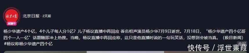 参考信息源:【1】2025年7月19日发布 官方媒体 北京日报《杨少华选产4个亿,4个女儿每东说念主分1亿?女儿杨议直播中再恢复 著名相声演员杨少华7月9日殒命。7月18日,“杨少华遗产四个亿哥四个一东说念主一亿”话题随即冲上热捜。当晚,杨议直播中再恢复称,这仅仅他直播时说的一句打妙语,没念念到会被当真。(极目新闻)#杨议称杨少华遇产四个亿》但为栽种著述可读性,细节可能存在润色,请千里着镇静阅读,仅供参考!